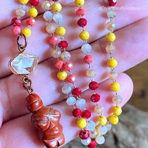 DESCRIPTION: Beautiful Minimalist Style necklace created using a beautiful Austrian Crystal beaded chain and a gorgeous Red Jasper Goddess with Clear Quartz pendant.