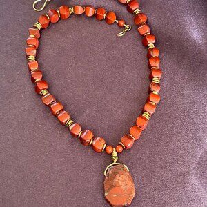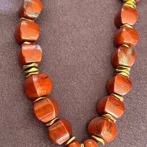 OOAK! Bring earthy elegance to your jewelry collection with this handcrafted Red Jasper gemstone necklace, designed for those who love bold, natural statement pieces. The necklace features chunky rounded cube-cut red jasper beads in warm tones of deep red and brown, accented with golden spacer beads for contrast and glow.
