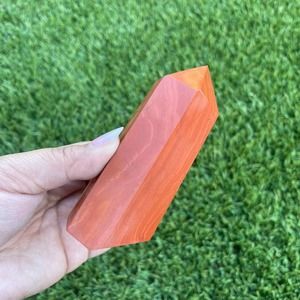 Red jasper tower. Approx 4.25” x 1.25” and 10.5oz (300g). It has a dent in the bottom of one side (best seen in photo #9) and an almost imperceptible dent on one edge (best seen in photo #11).