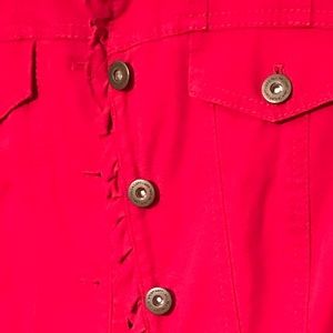 Loft fun RED denim Jacket! Brass buttons and small ruffles on the cuffs and front