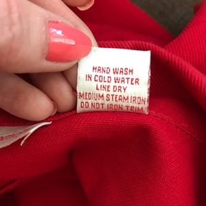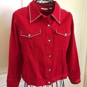 Darling rhinestone embellished red jean jacket from the Red Hat Society. Missing 2 stones on pocket flap- see pics. Size is small, but can fit medium.
