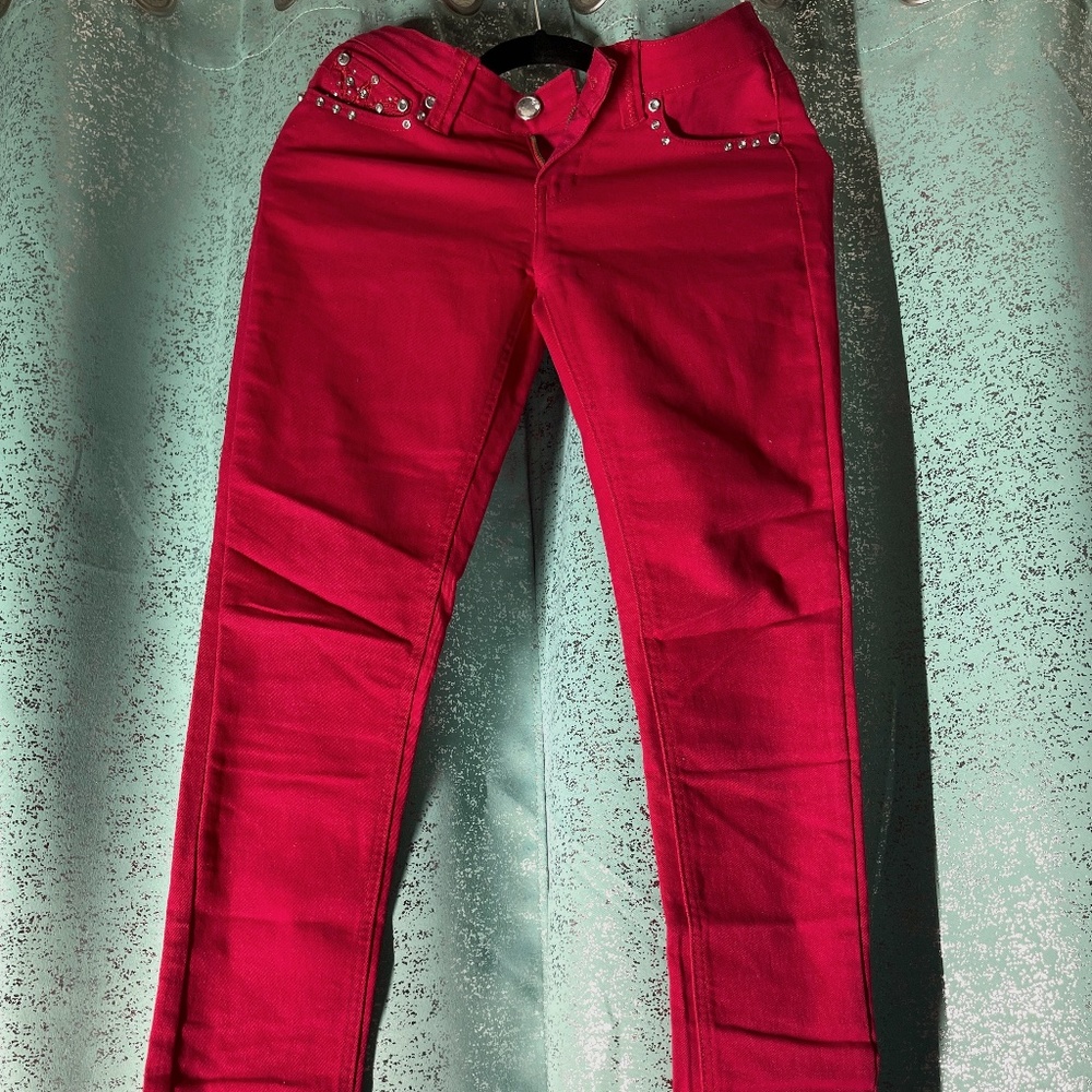This pair of jeans comes in a beautiful red color with stones on the back and front pockets. There a series of stain on the back, but otherwise it is in good condition and been used once. Size: 3.