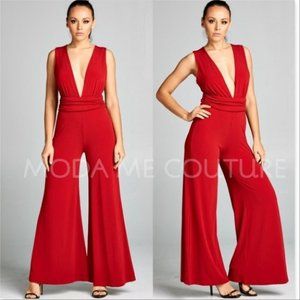 Our STELLA jumpsuit is perfect for any event! Chic, and effortless! Featuring Sleeveless plunging neckline and wide legged pants.