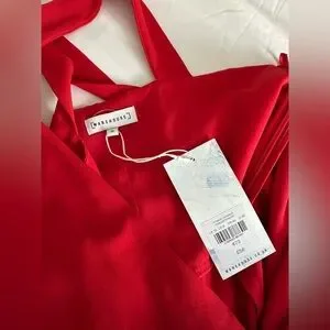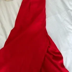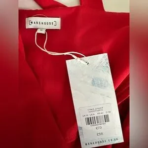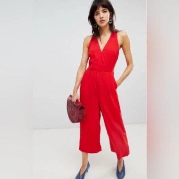 Bold red jumpsuit with a sleeveless design. Features a flattering V-neck
