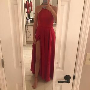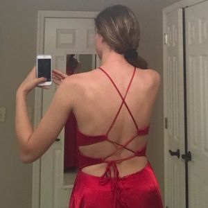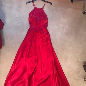 This formal dress is floor length and hasn't been altered. It is a size 11 in juniors and is long enough on me, who is 6'2". It is a satin polyester material. details include an open back with criss-cross straps, a high neckline, a slit, pockets, and built-in padding/cups in the chest. The dress has only been worn once and is in great condition. It is originally from Macy's.