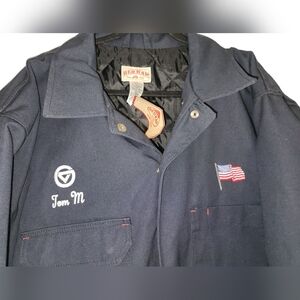 Keywords: Red Kap jacket, workwear jacket, embroidered jacket, mens jacket, lined jacket, pockets jacket, American flag, patch jacket, utility jacket, casual jacket, outdoor jacket, navy blue jacket, vintage jacket, RedHead workwear