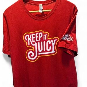 Vibrant red t-shirt with 'Keep it Juicy' graphic.