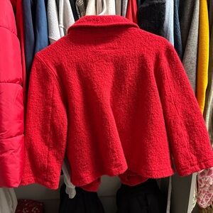 Bright red jacket with a stylish design. Perfect for keeping you or your child warm and fashionable.