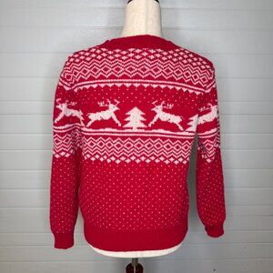 Festive red holiday sweater with reindeer and tree pattern. Cozy, warm, and great for winter or Christmas parties.