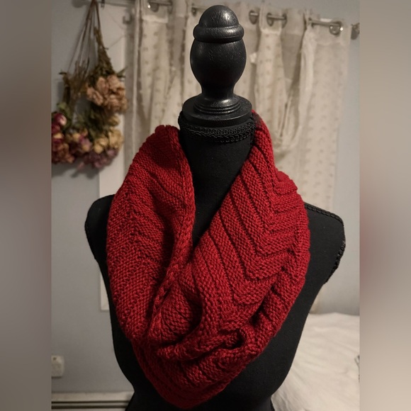 Cozy red knit infinity scarf. Perfect for chilly days.