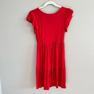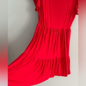 Bright red dress, perfect for Fourth of July, or any summer event! Ruffle tiered skirt, ruffle flutter sleeves. Stretchy and slinky rayon blend. NWOT.