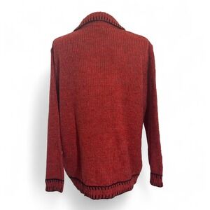 Rustic charm meets cozy comfort in this striking red knit sweater. The textured knit creates a visually appealing depth, while the quarter-zip design adds a touch of modern versatility. Notice the contrasting black trim along the collar, zipper, hem, and cuffs, providing a sophisticated edge to the relaxed silhouette. Imagine yourself wearing this sweater on a crisp autumn day, enjoying a leisurely walk through the park, or relaxing by a crackling fireplace on a chilly evening.