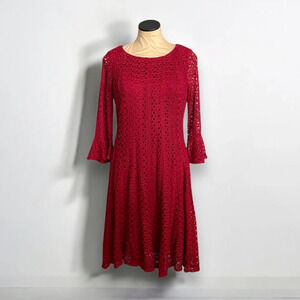 Red Knitted Overlay Midi Dress is new with tags. Dress is lined through body, a dark red color, with bell sleeves and flare body.