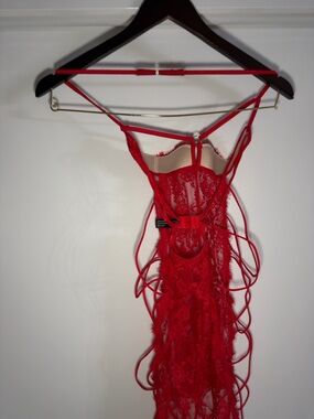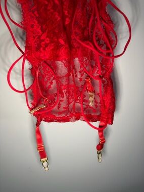 Seductive red lace chemise with open-cup design and side lace-up details. Adjustable straps for a customized fit. Elegant lace fabric that flatters the silhouette. Size M but fits smalls