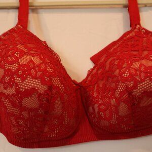 Like New Red Lace Bra. Size is European but bra measures like a 34-36 B/C. Bra has no underwire but is still very supportive. This bra is in beautiful shape, it was only worn 2x and has no stains, snags, holes or tears. This bra come from our smoke free pet free home. Bundles and offers always welcome.