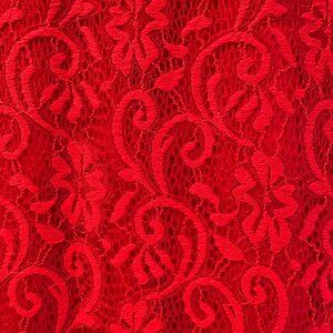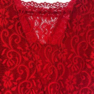 The perfect cocktail and party dress, this form-fitting red lace dress has two lengths - at or below the knee as its full length of lace dress and a mini-length for the show-through liner. This gives an eye-catching look with approximately 10" of see-through lace at the bottom. Note that it's listed as midi because the dress is that length, but in terms of coverage, because the bottom is see-through below the liner, full coverage is more of a mini-dress length. See-though lace sleeves and upper chest area as well. Machine washable on cold/gentle. A gorgeous dress that will draw compliments! I'm 5'10 1/2" and size 4, so length will be a bit longer than in the picture for most. Excellent condition - worn once. No snags, tears, stains etc. Like new.