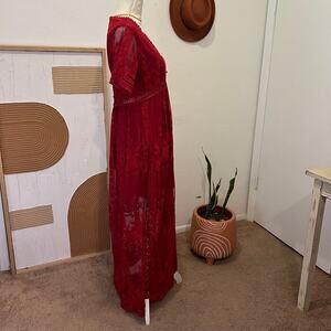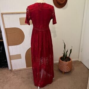 Red Lace Overlay Short Sleeve Deep V Neck Slit Maxi Dress Medium