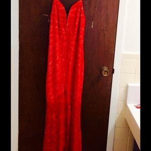 Mermaid cut with a deep V. All over lace design with zip up back. Tags are still on this dress and it has never been worn before. Size Large