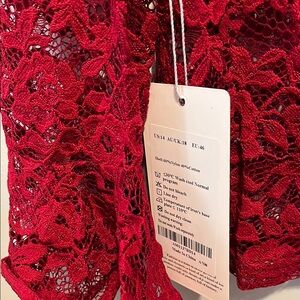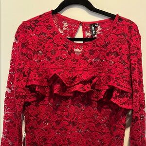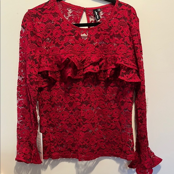 Elegant red lace top with ruffle detailing. Perfect for any occasion.