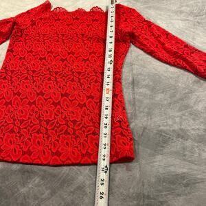Red Lace Top Women Medium Long Sleeves Shear Floral Lace Romantic Coquette Comfy. In excellent preowned condition. 95% nylon 5% spandex. Soft slightly stretchy. Hand wash. Has an inner tube blouse size medium to wear underneath the lace top. Can be machined wash. Measures 13 1/2 inches across top and 14 inches in length.