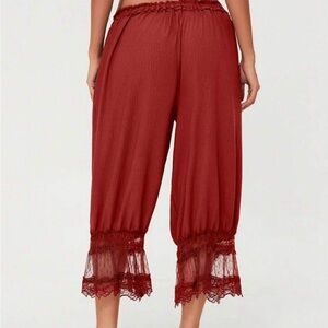 These red capris feature a romantic lace trim and a comfortable elastic waistband, perfect for lounging or casual outings. The mid-calf length and flowy fabric offer a relaxed fit, making them a stylish addition to your wardrobe.
