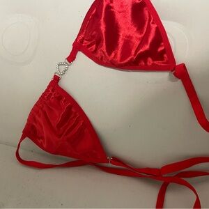 Stylish red lace top with matching satin skirt. Perfect for a bold look.