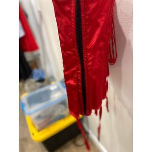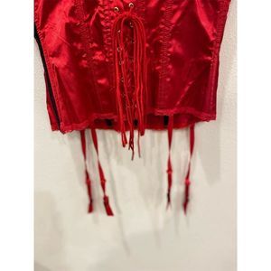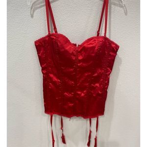 Turn heads and captivate hearts with the this Red Satin Corset Top. This stunning bustier, designed in a rich red hue, features a lace-up closure that adds a touch of allure to any ensemble. Love being able to use the garter straps for a variety of different styles. The sweetheart neckline and adjustable removable straps ensure a perfect fit, while cup design offers comfort without compromising on style. Perfect for a night out, a romantic dinner, or a special event, this corset top is your go-to for making a bold statement. Hand wash only to keep it looking its best. Condition: New.