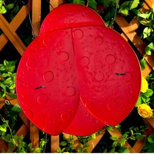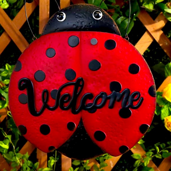 Charming red ladybug welcome sign with black polka dots. Perfect for adding a cheerful touch to your entryway.