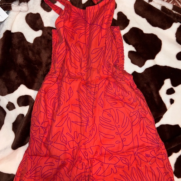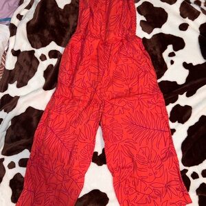 Vibrant red romper with a bold leaf pattern. Perfect for a stylish look.