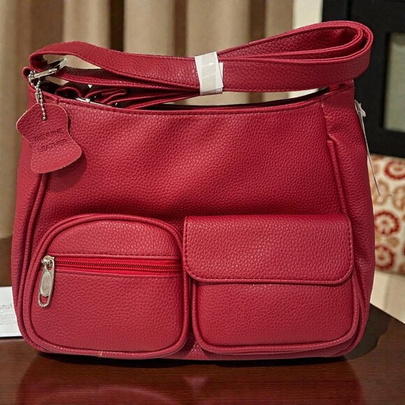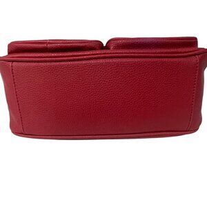 This d’margeaux New York genuine leather crossbody bag delivers the perfect mix of everyday function and minimalist style. Featuring a bold red hue with silver hardware, this bag is designed with two front utility-style pockets, a back zip pocket, and a spacious interior to carry all your daily essentials.