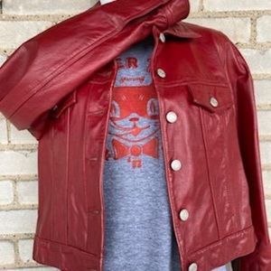 Very gently used, deep red, fully lined, super cute, leather jacket. (jean jacket style) Can be dressed up by wearing with a dress or lacy top, or worn with jeans and T-shirt. Very versatile. Perfect for Spring & Fall! Size small.
