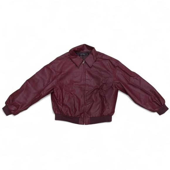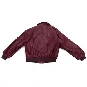 Classic bomber silhouette with a pointed collar. Full zip closure for easy wear. Elastic cuffs and hem for a secure fit. Smooth, slightly glossy burgundy finish. Versatile piece for casual looks.