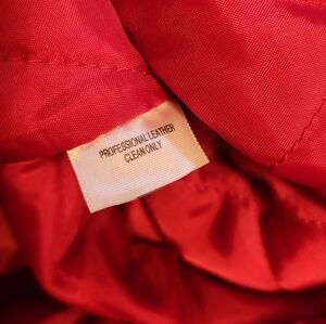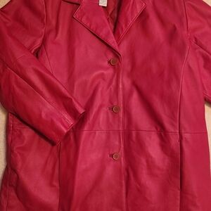 Size 24W genuine red leather jacket. Side pockets. All measurements lying flat: 35" length, shoulder to shoulder 19", and 26" pit to pit