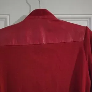 red leather jacket with ruffle-trim front. Sleek vertical paneling and a tailored silhouette. Lightweight and stylish for layering. Designed for polished, feminine looks.