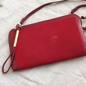 Versatile red leather/dyed fur clutch with removable crossbody straps; golden zipper/hardware. Inside compartments, including six card holders. Great condition (small spot with little hair missing on one side).