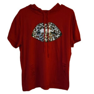 Cozy + cute is the perfect combo to describe this hoodie. A bright red background with a leopard lip graphic. Add a bit of edge with slits on both sides of the bottom. It's an XXL that could be perfect for an oversized comfy fit.