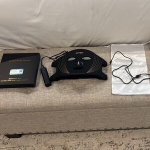 Comes with cloth bag and charging cable. Does not have instruction booklet. Can adjust time and color of light therapy.