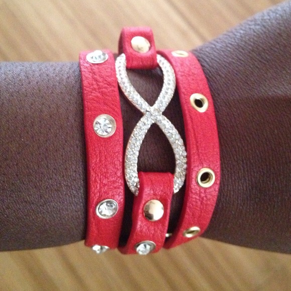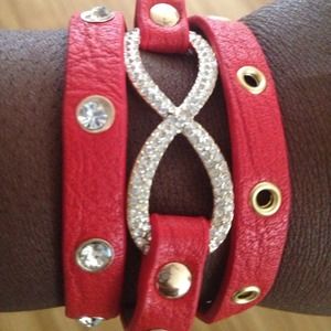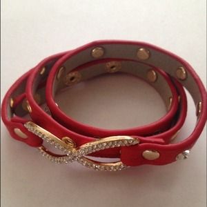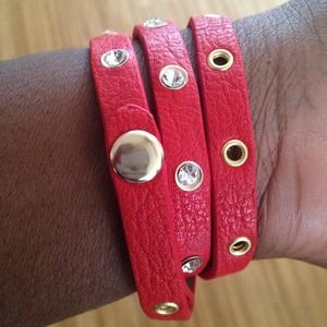 Red Leather wrap around cuff with bling and gold accents. Perfect accessory to sweeten up any outfit.