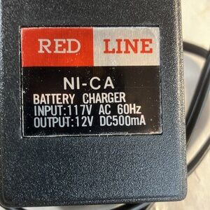 12 volt charger Red Line NI-CA Input 117V AC 60Hz, Output 12V DC500mA.