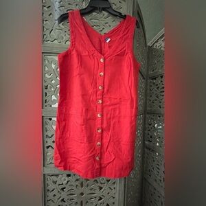 Chic red mini dress with button-front. Sleeveless, shift with pockets design. Perfect for casual outings.