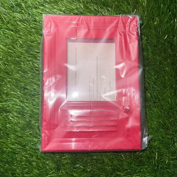 Locker-style metal photo frame in bright red. Holds a single photo behind a clear window. Has vented details and a snap closure. Fun, modern accent piece. Records a ten second message