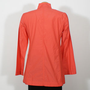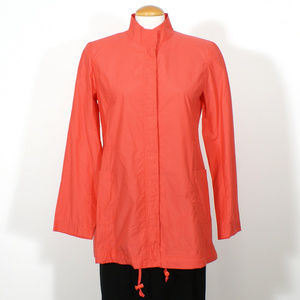 Lovely jacket done in weather resistant rainwear - cotton and nylon work together to resist wind and rain. It features high collar, hidden button front closure, patch hip pockets, princess seams, drawstring hem, and long sleeves. Unlined.