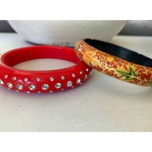 Red Lucite Rhinestone Bangle,1960s and Floral painted Wood Bangle - SET of 2