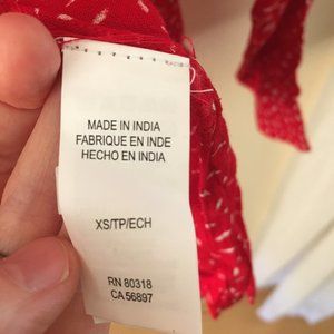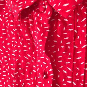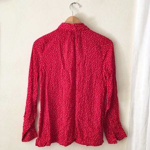 Red with white speckles long sleeve blouse. Fabric covered buttons with pleat detail on the back. Brand new, no tags.