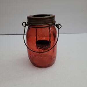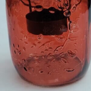 This is a rustic red-tinted glass jar, designed to function as a lantern or candle holder. It features a distressed, dark metal lid and a wire handle attached to the jar's neck, allowing it to be hung. Inside, a small dark object, likely a tea light or votive candle, is visible, suggesting its intended use for ambient lighting. The glass itself has a textured or embossed pattern, adding to its decorative appeal.