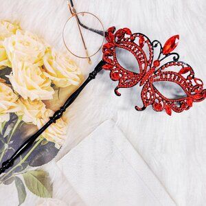 Red Masquerade Mask, Crystal Handheld Mask, Black Mask with Stick, Venetian Mask