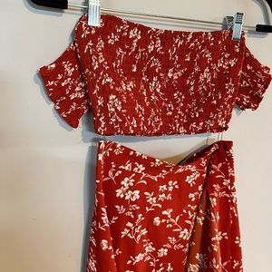 Matching red two piece summer set. Off or on the shoulder crop top and wrap skirt. Size large but runs small (this fits like a small) 35% polyester 65% cotton