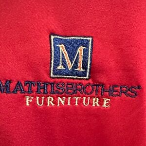 Stylish red zip-up jacket with Mathis Brothers logo. Perfect for casual wear. Size 4XL like new still has partial tag cord