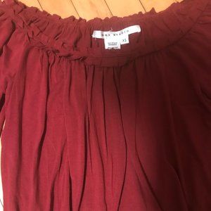 This is a lose, comfortable shirt to wear. The sleeves are three quarters with elastic stitching at end of sleeves. This gives a stretch to fit your arm properly and gives the sleeves a fuller effect. My favorite part of this shirt is the neckline. It has a dainty gathered look of it's own. This top can be worn both on the shoulder or slightly off. The bodice of the shirt is short and hits approximately at the waistline. You can wear a tank top under and looks great with jeans.