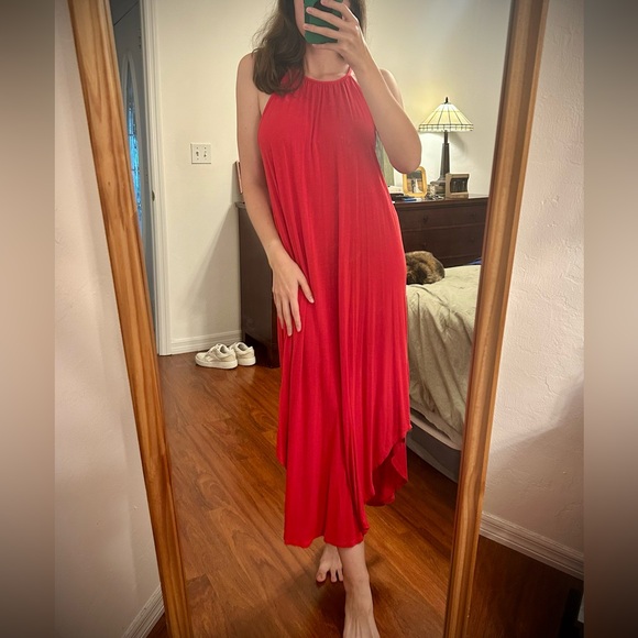 Chic coral red dress with a flowing, beachy design. So soft, stretchy, and comfortable. Can fit most sizes (I’m a size small).
